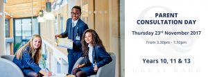 I would like to invite parents and carers of students in Years 10 11, and 13 to a Parents’ Consultation Evening on Thursday 23rd November 2017.