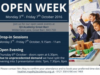 Open Week at Q3 Academy Great Barr will be Monday 3rd – Friday 7th October 2016, please see below for more details.
